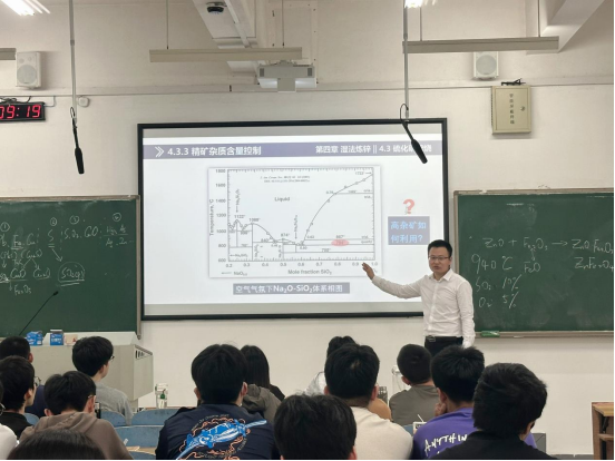 课堂伊始,夏隆巩老师结合行业前沿发展动态和生产实际,以湿法炼锌为核心内容,深入浅出地展开讲解。他有条不紊地讲授了硫化锌精矿焙烧与浸出的理论知识,并结合生产应用及设备工艺相关内容,层层递进地引导同学们深入探索冶金学的奥秘。同时,夏老师灵活运用PPT展示和随堂提问的互动方式,极大地激发了学生们的学习兴趣和参与热情。他的板书清晰合理,教学表达流畅,内容深入浅出,使得整个课堂氛围轻松活泼,生动有趣。